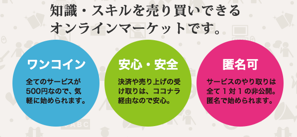 ココナラとは、多数メディアでも紹介されている、最近話題のワンコインでサービスを受けられる大人気のワンコインオンラインマーケットです。